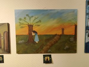 في الخلفية، تظهر شجرة أخرى خالية من الأوراق، في دلالة على وجود أشخاص أو أشياء في حياتنا لكنها لا تقدم الدعم الحقيقي. أما الطريق الخشبي الممتد في اللوحة، فيرمز إلى طريق الحياة والاستمرار فيه رغم الصعوبات والتحديات.