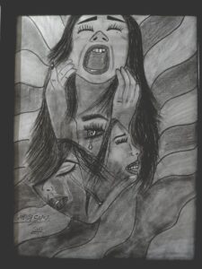 *واستخدام ميكس الرصاص مع الفحم” عشان يزود الإحساس بالعمق التظليل معبر عن عمق المشاعر والتوتر الداخلي عن الحزن وعن أعباء نفسيه مكبوته وصعوبة التعبير عنها بالكلام *والرصاص ساعدني اظهر ادق التفاصيل اللي بتوصل الحاله النفسيه بوضوح *الفحم سمح ليا بظلال غامقه الإحساس والقلق وخلق التعزيز بالكآبة وساعدني إبراز ادق واهم التفاصيل